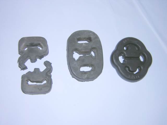 Takhle to vypadá - vlevo ten přetržený je ten co drží zadní tlumič a taky prostřední tlumič zboku. Uprostřed je ten, který drží potrubí mezi tlumiči. Tyhle mi prodali před 2 lety přímo v autodílech Fiat. Dneska jsem kupoval jiné, v obecných autodílech, prodali mi to co vidíte vpravo a tím to nahradím. Cena 30,- / ks.